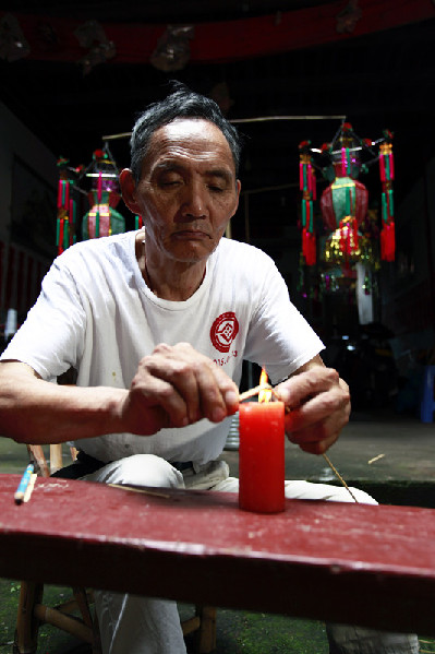 ▲刻花 朱口花燈制作工藝十分考究,每盞花燈都熔編扎、剪紙、鏤雕、繪畫(huà)、紙?jiān)榷囗?xiàng)技藝于一爐,追求細(xì)膩、逼真的藝術(shù)效果,每盞花燈都可以看成為一種獨(dú)立的工藝品,可以單獨(dú)地把玩觀賞。其色彩大紅大綠,對(duì)比強(qiáng)烈、顯示出熱鬧、火爆的節(jié)日喜慶氣氛,富有濃郁的鄉(xiāng)土氣息。 在以前,朱口每年舉行兩次燈會(huì),一次是正月十五元宵節(jié),一次在農(nóng)歷二月初四的媽祖廟會(huì),尤以二月初四的燈會(huì)最為熱鬧,白天迎神,晚上觀燈,非常緊湊。朱口燈會(huì)的組織工作由各坊的“燈案”組織負(fù)責(zé),過(guò)去朱口分八個(gè)坊,坊坊都有燈案。朱口是泰寧最大的鄉(xiāng)鎮(zhèn),人煙稠密,加上周邊梅花村落,總戶(hù)數(shù)在兩千多戶(hù)以上,因此年年花燈數(shù)量都很多,加上燈會(huì)中的旱船、高廠、高蹺、蚌殼舞、采茶撲蝶舞等文娛表演以及鑼鼓、笙管弦樂(lè)隊(duì)伍,花燈游行都達(dá)一華里多長(zhǎng),聲勢(shì)浩大,十分壯觀。燈會(huì)期間,各坊的燈案又互相攀比,競(jìng)賽,更推動(dòng)了花燈品種、技藝的進(jìn)一步提高。 到朱口村街口,遇見(jiàn)了正在等我們的蕭由榕老人。今年68歲的蕭由榕老人是朱口花燈的傳承人,他從迷上、到制作花燈近四十年了。