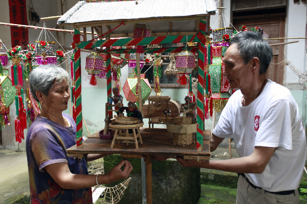 蕭由榕老人制作花燈幾十個(gè)年頭,始終堅(jiān)持用手工制作方法,外表用鏤空的木樨花剪紙糊上。燈內(nèi)的煤油燈或蠟燭點(diǎn)亮?xí)r,燈光透過(guò)鏤空的剪紙折射出來(lái),形成了燈籠各面上的投影不斷變換,顯現(xiàn)流光溢彩。可以這么說(shuō),每盞花燈都是這位老人巧奪天工的工藝品,既可以欣賞,也可以把玩。 制作好一盞花燈后,蕭由榕老人興致很高,把他做的最有特色的花燈一一展示出來(lái)。他說(shuō):“這盞斗雞燈,只要用手拉拉繩子,就像兩只公雞在爭(zhēng)斗。有一次,我拉斗雞燈,我家的公雞一起參加搏斗,好玩的很。”他叫上老伴,兩人配合,一起拉動(dòng)農(nóng)作坊燈的機(jī)關(guān),擺弄了起來(lái)。只見(jiàn)竹篩、磨礱、風(fēng)車(chē)、舂米也轉(zhuǎn)動(dòng)了起來(lái),真是讓人吃驚。他說(shuō):“農(nóng)作坊燈是農(nóng)村生活的場(chǎng)景,是我請(qǐng)教其他老人后,自己再慢慢研究、琢磨出來(lái)的。” 停下后,蕭由榕老人說(shuō)出他的心愿:“現(xiàn)在我會(huì)做宮燈、百合、凈瓶、斗雞、小龍頭、鯉魚(yú)、走馬宮燈等花燈,可有些花燈只有為數(shù)不多的老人會(huì)做,大概也只有五、六個(gè)會(huì)做了。我再不像他們請(qǐng)教,以后可真就沒(méi)有了。我準(zhǔn)備要向這些老人請(qǐng)教,學(xué)會(huì)他們的技藝,再琢磨出新的花樣,讓朱口的花燈不會(huì)失傳,也可以創(chuàng)新。為了制作花燈,現(xiàn)在我叫女兒來(lái)學(xué),讓她來(lái)傳承。” 聽(tīng)蕭由榕老人說(shuō)完,心想:這么好的非遺瑰寶、這么生動(dòng)靈巧的花燈,要是沒(méi)有了傳承,怎么能讓人記住鄉(xiāng)愁?要讓非遺瑰寶代代傳承,就要在政府、社會(huì)、傳承人之間建立一個(gè)好的聯(lián)動(dòng)機(jī)制,只有這樣,文化遺產(chǎn)才可以發(fā)揚(yáng)光大、代代相傳。
