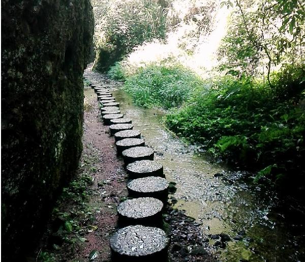 【時空隧道】 矮小的石墩立在溪水之上,時有點點順著石壁落下,在溪水表面,撞開圈圈漣漪,人工石臺和自然崖壁的結(jié)合,是遠古和現(xiàn)代的一場對話,仔細欣賞石崖上頭,可發(fā)現(xiàn)斑駁的古時文字痕跡,串聯(lián)成超時空密碼,靜靜等待來人傾聽它的聲音。人工石臺較為矮小,在行走時,應(yīng)當(dāng)注意老人和小孩的安全,雨水季節(jié),難免濕滑,在嬉戲的過程中,也要注意腳下。