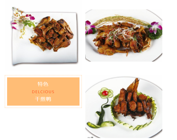 紅菇產于泰寧縣西部小北斗山地。小北斗紅菇與別處所產不同,其特點:菇面色澤分明,色紫紅,菇內頁層規則,白澤泛綠,菇莖堅實粗短,顆粒均勻,肉質厚嫩;煮熟后,味清鮮甘美,入口細嚼不澀不滑,纖維細而易化,色、香、鮮、嫩出眾,營養豐富,含高蛋白、維生素、無機鹽、糖類和礦物質等。 干煎鴨 干煎鴨是泰寧的農家特色菜。鴨肉色澤油亮、外焦里嫩,微帶韌勁,香酥多汁。