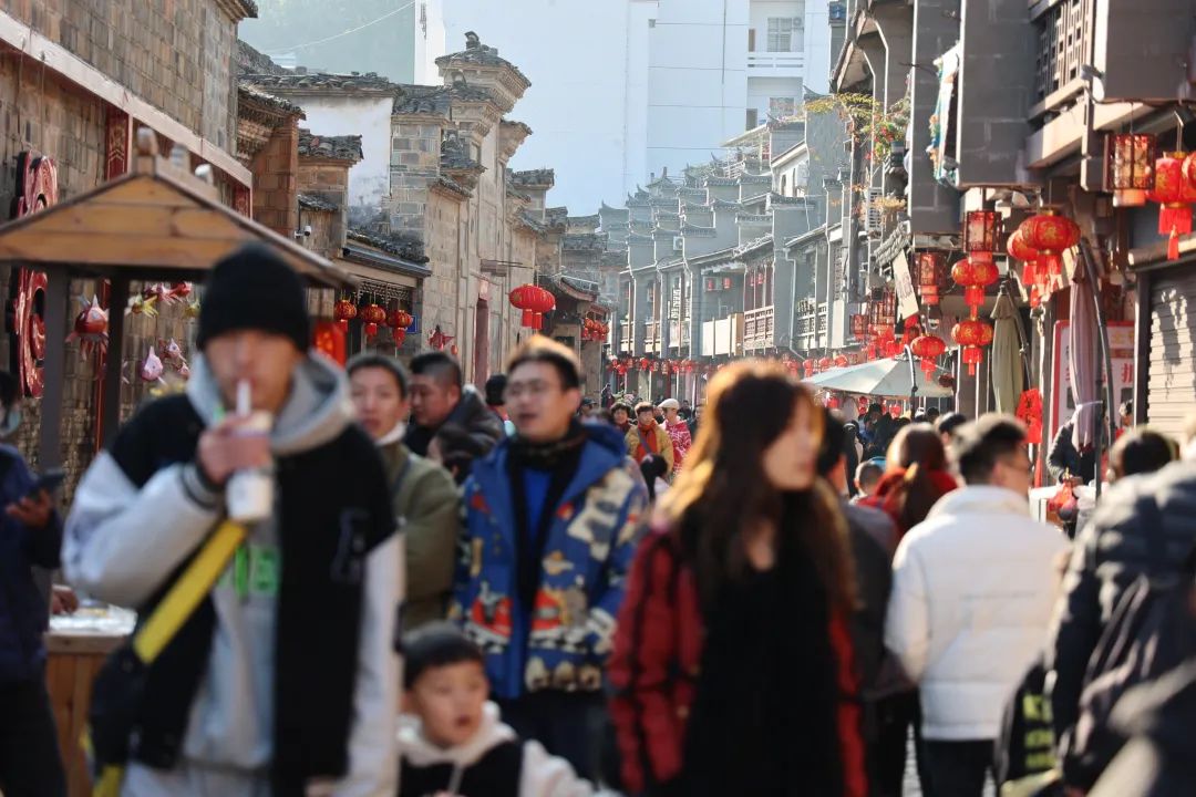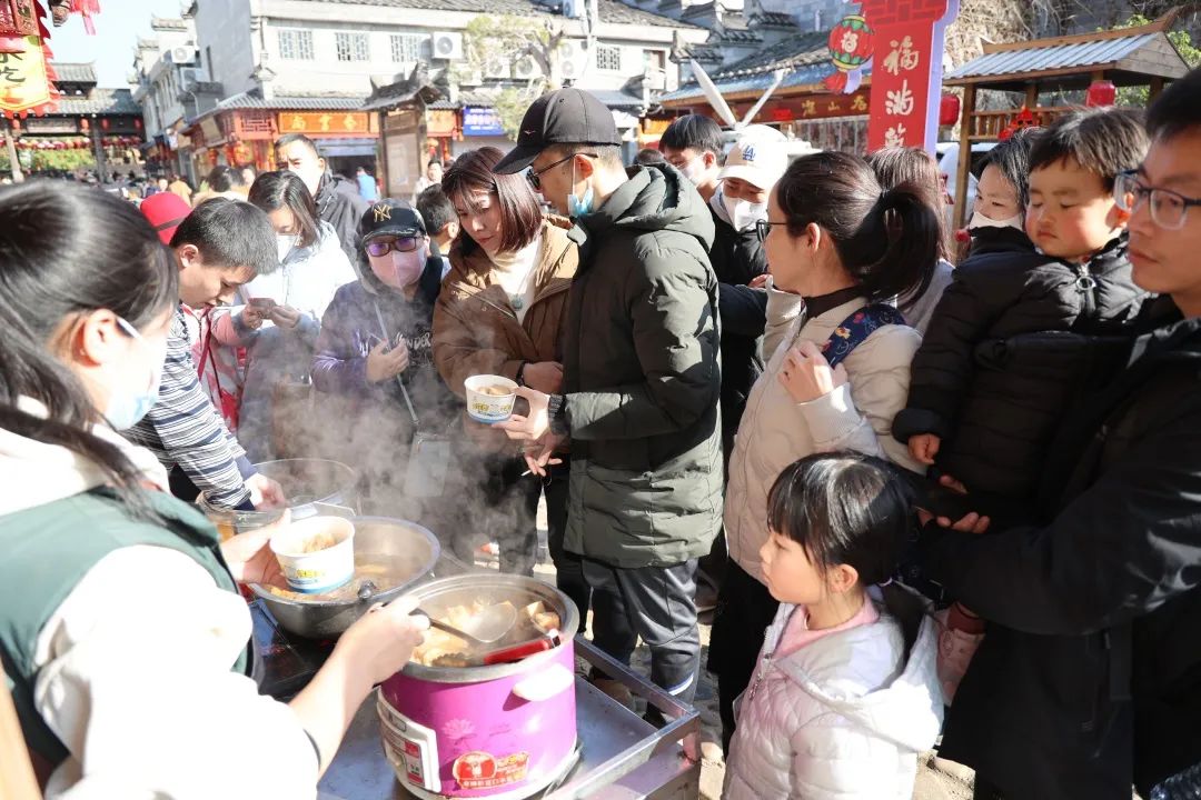 在泰寧古街上,人潮涌動、熱鬧非凡,非遺博覽苑內大龍擂茶、上青棕編等不少非遺項目正在進行展示,來往的游客品嘗著本地特色小吃,并不時駐足在大型福字燈籠前拍照打卡,品味著小城獨特的新春年味。