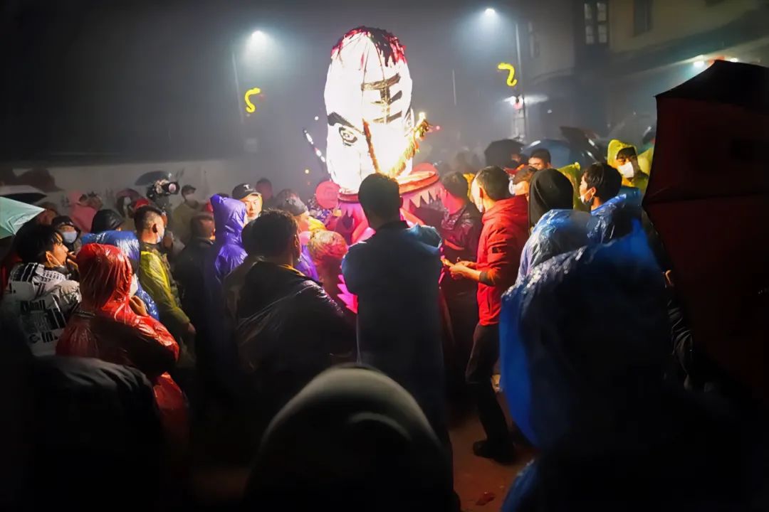 夜幕降臨后,這條“火蚯蚓”在集鎮(zhèn)街道上前進(jìn)、后退、走跑、急停。游到街道的拐角處時(shí),扛燈的村民開始向反方向跑起來,一節(jié)節(jié)板凳被扯斷,元宵鬧燈的氣氛也被推向高潮。