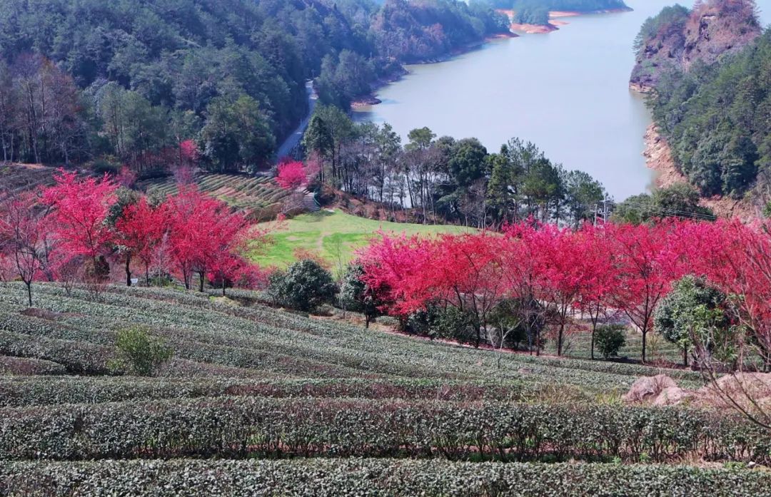 近日,泰寧境元生態茶園內櫻花正盛。抬眼而望,大金湖景區丹山碧水便在眼前,左邊十里平湖,右側仙壽奇山,如身在畫卷中。