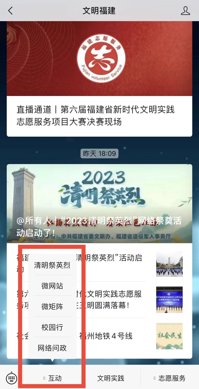 手機參與入口 關注“文明福建”或“文明三明”微信公眾號,點擊《@所有人|“2023清明祭英烈”網絡祭奠活動啟動了!》推文,進入活動專題頁面。或點擊公眾號左下方欄目,選擇進入“清明祭英烈”活動專題頁面。