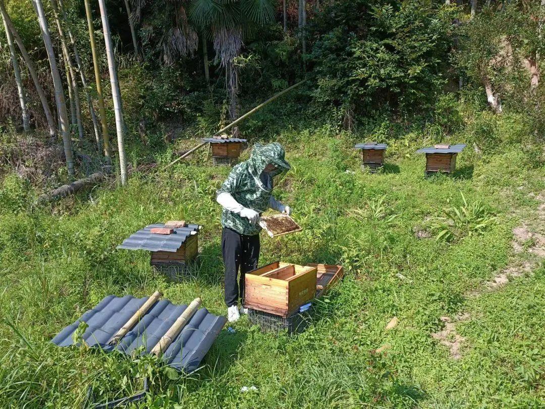 寧路村擁有近1.6萬畝的林地,且闊葉林多以烏桕樹為主。于是,余忠文與老黨員余佐慶因地制宜帶頭發展林下養蜂特色產業,先后成立四季家庭農場和古圩寧路家庭農場,輻射帶動村內20余戶農戶參與,截至目前,已帶動村民及周邊村發展中蜂養殖至800余箱。