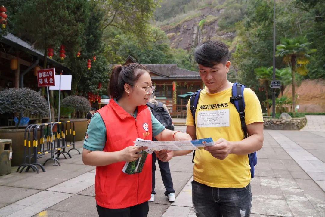 “游客朋友您好,請您有序排隊,不要擁擠,注意安全······”10月4日,在泰寧縣九龍潭景區,志愿者正在開展文明旅游宣傳活動,勸導游客有序排隊、文明游覽。