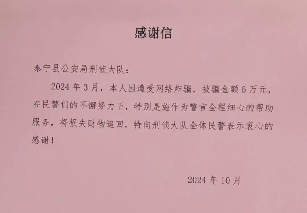 “破案神速揚警威 執法為民鑄警魂” “為民辦實事 人民好警察” 近日 泰寧縣公安局刑偵大隊民警 成功為轄區群眾追回被騙資金8萬元 收獲兩面滿載謝意的錦旗 和一封感謝信 “施警官,實在太感謝你們了,沒想到被騙的錢還能追回來!”。日前,鄧先生將一面寫著“破案神速揚警威,執法為民鑄警魂”的錦旗送到刑偵大隊民警施作為手中,感謝民警盡心盡責,幫助其挽回被騙損失。