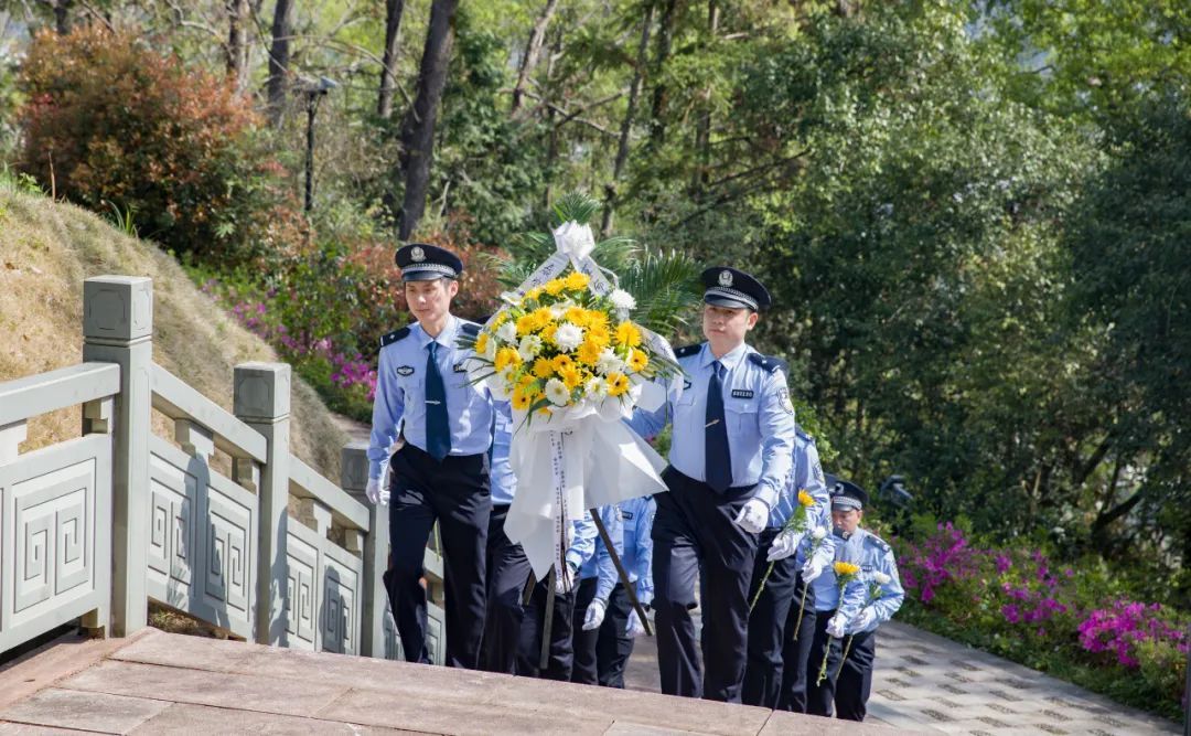 4月2日上午,泰寧縣公安局民警、文職、輔警代表整齊列隊,至爐峰山烈士紀念碑進行祭掃緬懷、瞻仰參觀,他們通過默哀、敬獻鮮花、重溫人民警察誓詞等方式寄托哀思,向為守護人民安寧而獻出生命的英烈致以最誠摯的敬意。