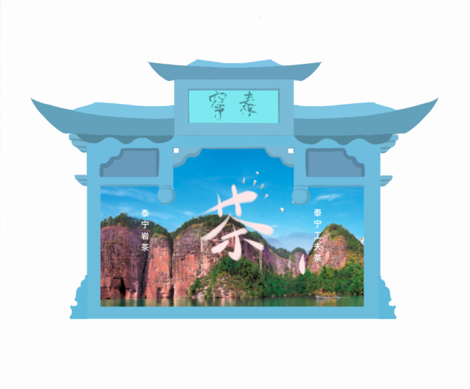 (1)茶樓云雨:設計以傳統建筑打卡墻造型,融合泰寧茶山+臺灣經典建筑,中間設計突顯“茶”字表示活動主旨,嘉賓可在此處拍照留念。