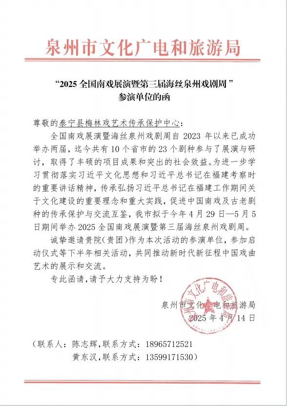 4月29日至5月5日,"2025全國南戲展演暨第三屆海絲泉州戲劇周” 在福建泉州盛大啟幕。此次戲劇盛會匯聚全國優秀戲曲藝術成果,以 “南戲” 為核心,融合海絲文化特色,打造極具影響力的戲曲交流平臺。屆時,泰寧梅林戲《跳加官》《梅林謠》將亮相開幕式,經典劇目《洪蘇秀哭監》《關公怒?巧推》將亮相“泉州有戲·南戲十二時辰”之“稀有劇種”系列展演,共同推動戲曲藝術正本清源、守正創新。