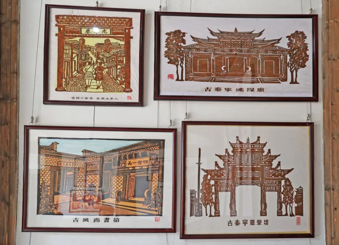 梁光葵(右)在老宅內查看布展效果 2013年,其作品《康樂》榮獲中國老體協會夕陽燦爛獎;2015年,作品《祥和》獲得中國計生協會優秀獎。剪刀開合間,落下的是紙屑,留住的是時光。 為了讓人們更深入地了解泰寧,梁光葵憑借記憶和文獻資料,用剪紙復刻了70年代被拆除的泰寧孔廟。他巧妙地將建筑的透視關系轉化為剪紙語言,讓平面的剪紙呈現出三維空間感。那些被歲月抹去的飛檐翹角、月臺欄桿,在他的刀尖下重煥生機,盡顯古韻典雅。