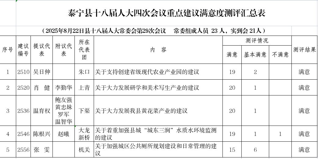 會(huì)議聽(tīng)取和審議了縣政府關(guān)于2025年上半年計(jì)劃執(zhí)行情況的報(bào)告、關(guān)于2025年上半年預(yù)算執(zhí)行情況的報(bào)告、關(guān)于鄉(xiāng)村振興工作情況的報(bào)告、關(guān)于教育高質(zhì)量發(fā)展工作情況的報(bào)告、關(guān)于縣十八屆人大四次會(huì)議代表意見(jiàn)建議辦理情況的報(bào)告和關(guān)于監(jiān)委專項(xiàng)工作情況的報(bào)告,并對(duì)重點(diǎn)建議辦理情況進(jìn)行滿意度測(cè)評(píng)。 重點(diǎn)建議測(cè)評(píng)結(jié)果,點(diǎn)擊圖片可放大查看