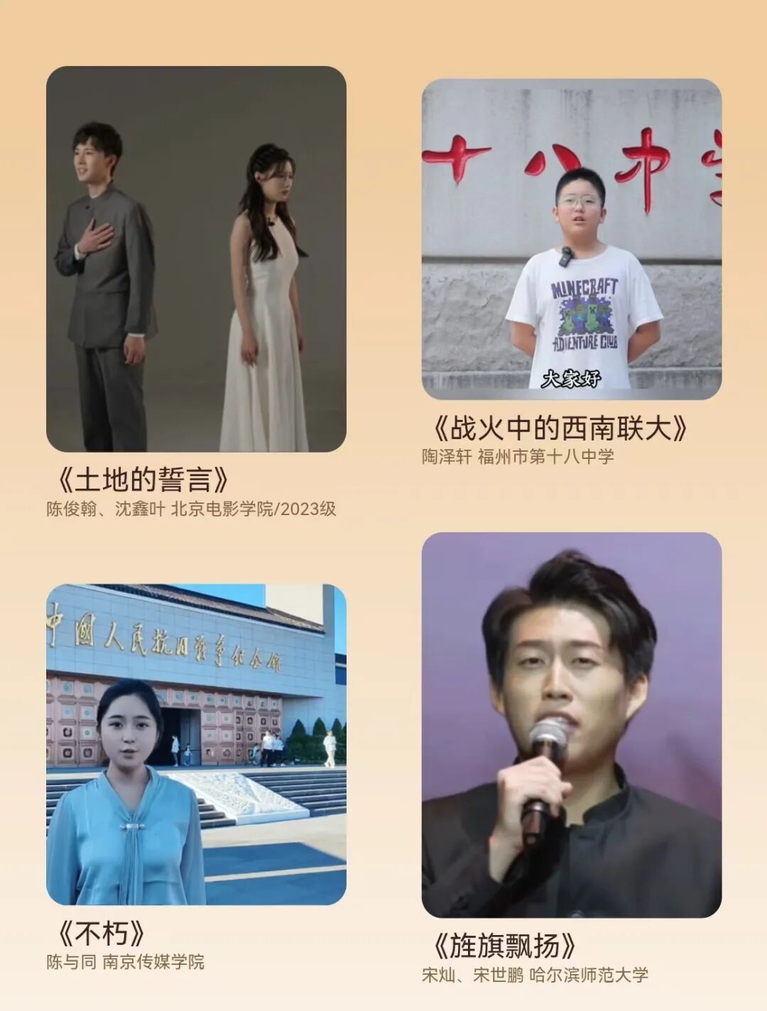 《烽火記憶——百名抗戰(zhàn)老兵口述史》,通過100集廣播系列報道、100集融合傳播作品、100集AI視頻和1個創(chuàng)新應(yīng)用產(chǎn)品,融合呈現(xiàn)出一位位為國家與民族付出青春熱血的抗戰(zhàn)老兵形象。這不僅是對崢嶸歲月的追憶,更是讓不屈的抗戰(zhàn)精神跨越時空、接續(xù)傳承的使命擔(dān)當(dāng)。 這是一次“跨越時空”的 精神相遇 八十年前,先輩們用生命換來了抗戰(zhàn)的勝利;八十年后,全國各地的青少年用作品搭建記憶的豐碑。 創(chuàng)新應(yīng)用開設(shè)了“思政學(xué)堂”版塊,面向全國學(xué)子發(fā)起抗戰(zhàn)主題文藝作品征集活動。無論是筆尖流淌的墨痕,鏡頭捕捉的感動,還是聲線傳遞的赤誠,都是對抗戰(zhàn)精神最鮮活的詮釋。青少年用青春創(chuàng)意讓歷史不再塵封,讓抗戰(zhàn)精神永遠(yuǎn)年輕! 在作品征集中,福建新聞廣播攜手中廣聯(lián)合會有聲閱讀委員會向全國高校發(fā)出征集通知,目前全國已有近30家學(xué)校的學(xué)生參與;全國近百家主流媒體也同步開展征集活動,擴大征集范圍和影響力,讓廣大青少年不僅成為紀(jì)念抗戰(zhàn)勝利80周年的參與者,更成為愛國主義和抗戰(zhàn)精神的傳承者、傳播者。