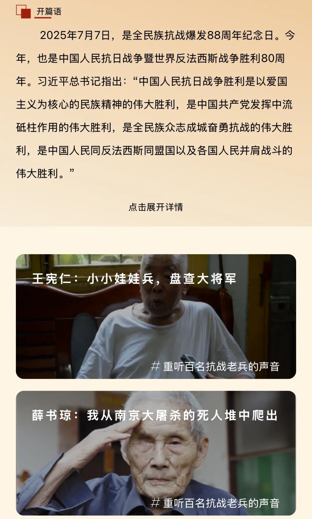 創(chuàng)新應(yīng)用還設(shè)置了專題報道、星火文藝集、烽火書畫志等多個版塊,打造“云端紅色展覽館”,充分展現(xiàn)全國各地對抗戰(zhàn)歷史和抗戰(zhàn)精神的傳承與弘揚,筑牢人們尤其是青年一代的歷史認(rèn)知與家國情懷,全國各省市廣電主流媒體及合作單位的加入,豐富了“云端紅色展覽館”的內(nèi)容,激活了社會力量參與紅色文化創(chuàng)新傳承的積極性。 指尖劃過屏幕,80年前的硝煙與今天的和風(fēng)相擁,在掌心里漾開穩(wěn)穩(wěn)的幸福。當(dāng)槍炮聲漸漸遠(yuǎn)去,讓我們傾聽老兵的聲音——聽槍林彈雨中的吶喊,如何鑄就不屈的國魂;聽耄耋之年的叮嚀:勿忘國恥,振興中華!記住戰(zhàn)火的殘酷,才更懂得和平的珍貴;記住先輩的抗?fàn)帲鸥宄约涸撊绾谓舆^ “接力棒”。 從沒有理所當(dāng)然的和平,它蘊藏著先輩用熱血換來的基石。唯有帶著這段烽火與堅守的記憶前行,中華民族偉大復(fù)興的道路,才會走得更堅定、更長遠(yuǎn)。