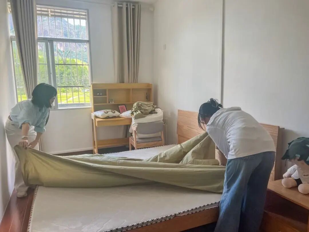 干部們分工協作,熟練地為姐弟倆換上新的床上四件套,并進行了簡單的新房裝飾,讓他們切實感受到黨和政府的關愛與溫暖。 團縣委副書記 黎曉妹:“我們對27名無獨立居住和學習環境的困境兒童實施‘希望小屋’工程,通過改造原有住房、配備必要家具和學習用品,打造他們的獨立生活空間。”