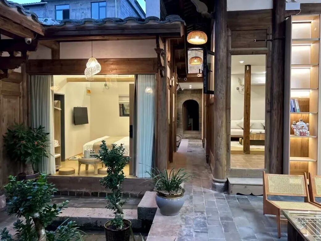 經(jīng)營私影館的日子里,黃莉親眼見證著古城的變化:青石板路上的游客日漸增多,茶館、酒館、民宿、電商直播等業(yè)態(tài)愈發(fā)多元、鮮活。這份蓬勃的生機(jī),讓她堅(jiān)定了深耕古城的決心——將創(chuàng)業(yè)的腳步,邁向更深的街巷,更老的建筑。 2024年,黃莉?qū)⒛抗馔断蛄松袝餁v史文化街區(qū)深處的黃家祖宅。這座始建于清代早期的建筑,迄今已有近四百年歷史,承載著家族記憶與古城文脈的根。為了讓祖宅涅槃重生,在政府完成主體結(jié)構(gòu)修繕的基礎(chǔ)上,她與丈夫帶領(lǐng)團(tuán)隊(duì)結(jié)合歷史建筑的保護(hù)價值與現(xiàn)代功能的需求,在不破壞黃家祖宅整體風(fēng)韻的基礎(chǔ)上,增加了許多現(xiàn)代智能設(shè)施,打造出一家具備SPA養(yǎng)生功能的特色民宿——拾天庭院。